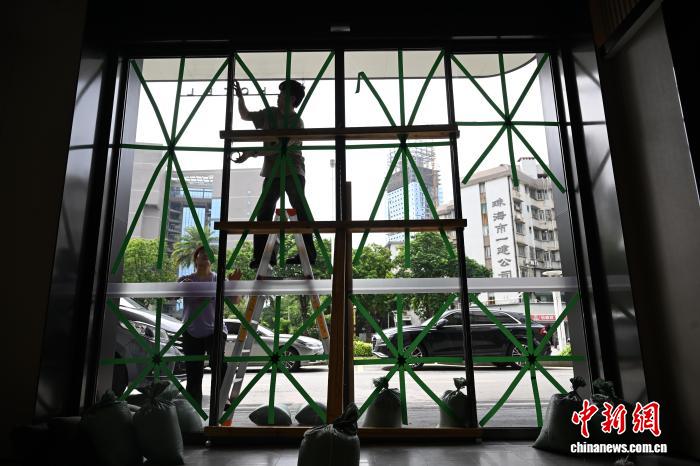 9月23日,往年第18号台风“桦添沙”切近亲近,广东省珠海市1旅店的任务职员正在玻璃门上粘揭防风胶条。中新社记者 旧楚白 摄