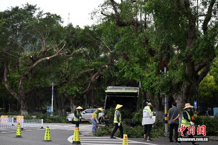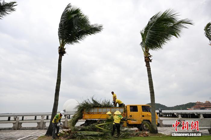 9月23日,往年第18号台风“桦添沙”切近亲近,任务职员正在广东省珠海市远洋道里干佳树枝整理任务。中新社记者 旧楚白 摄