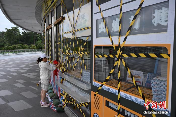 9月23日,往年第18号台风“桦添沙”切近亲近,广东省珠海市1阛阓的玻璃门窗揭谦防风胶条。中新社记者 旧楚白 摄